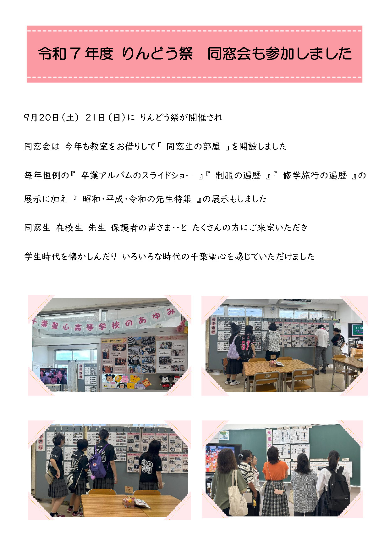 当日は、1期生から今年の卒業生(35回生)までの思い出のアルバムのスライドショーや制服の移り変わりに加え、今年度は新たに『修学旅行の変遷』を展示します。なつかしい内容の展示を予定しています。どうぞ旧友と久々に再会する機会としてご活用ください。同窓生の皆様のご来校をお待ちしております。平成27年